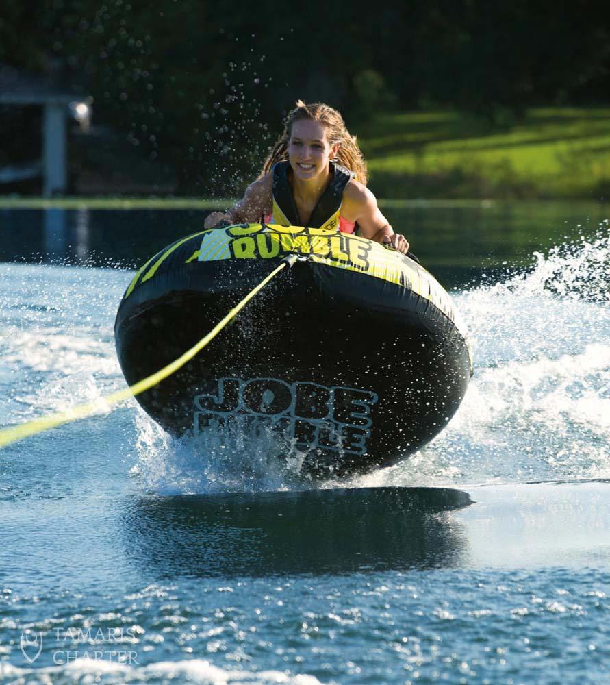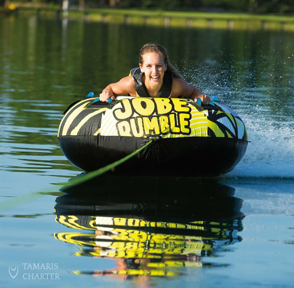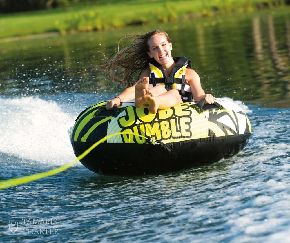 Are you ready for a water tube adventure in Croatia? Let’s get ready to Rumble! Our super-fast Rumble can handle 1 person. It comes with 4 handles that allow you to sit or lay on the tube. Plus a drain to guarantee good water release after a wild ride. Fun is guaranteed riding the water tube in Trogir! Choose one of our fun extra activities to spice up your boat adventure in Croatia. The water tube sounds promising, doesn’t it? In case you are not sure if it is the right choice for you, check out our other extra features.